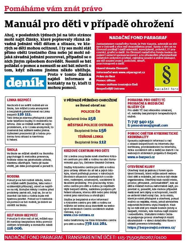 Tento manuál je určen (nejen) Ostravským dětem ke získání informací, kde a na koho se mohou obrátit, pokud se stanou obětí trestné činnosti jiného nebo pokud by se dozvěděly, že je ubližováno někomu jinému. Tento manuál završil sérii článků určený dětem, které jsme publikovali v rámci společného projektu našeho Nadačního fondu Paragraf s Moravskoslezským Deníkem.